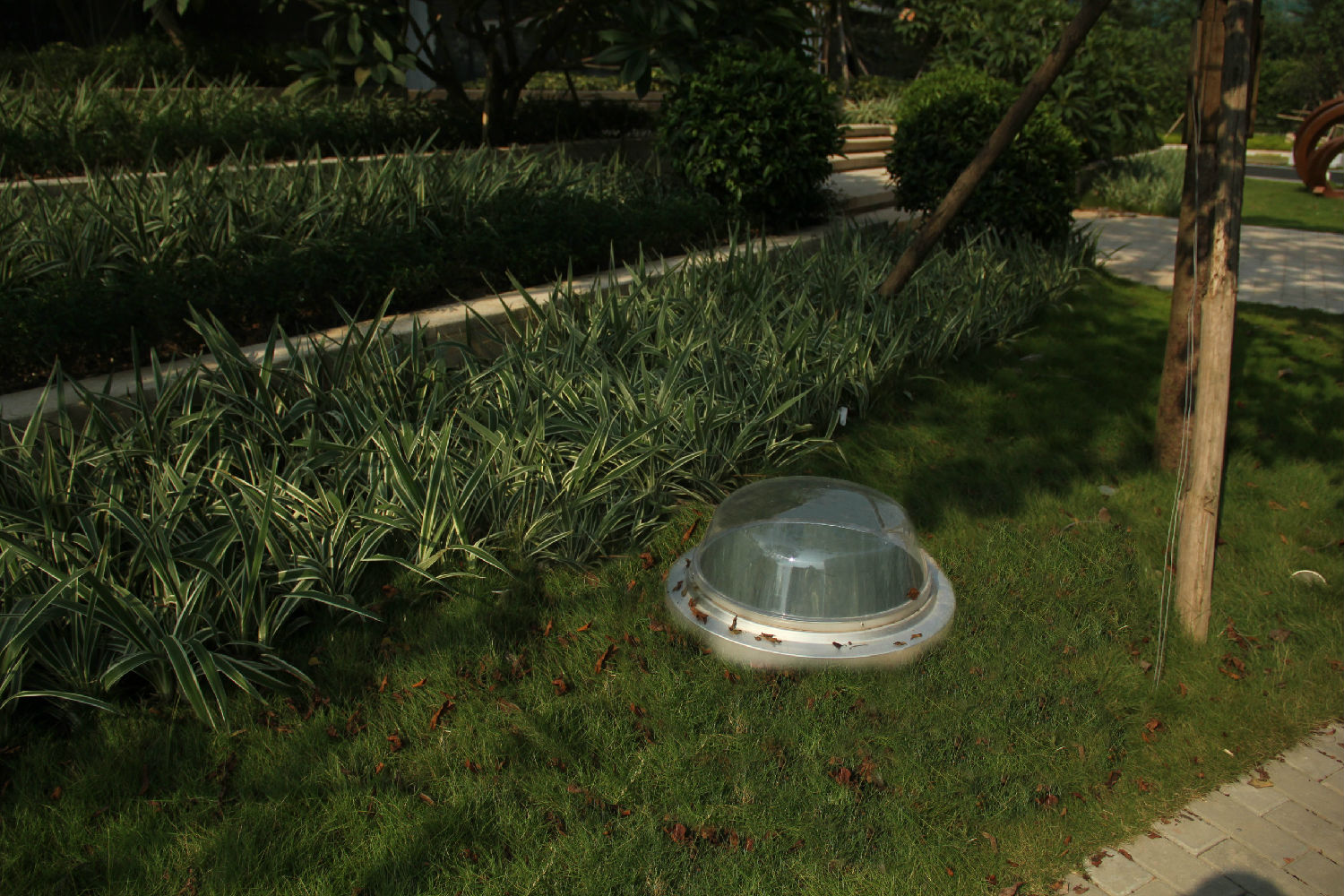 進(jìn)入金山谷創(chuàng)意園,在綠化帶、小路上可見一個(gè)個(gè)采光罩,小小的一個(gè)采光罩收集的自然光和太陽(yáng)光足以照亮地下80-120平方米的室內(nèi)空間,并不會(huì)破壞建筑整體的美觀。